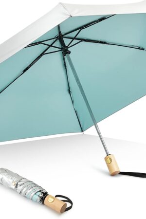 UPF 50+ UV Protection Travel Umbrella with Wooden Handle, 42 Inch Lightweight Sun Rain Folding Umbrellas Auto Open Close (Lake Blue)